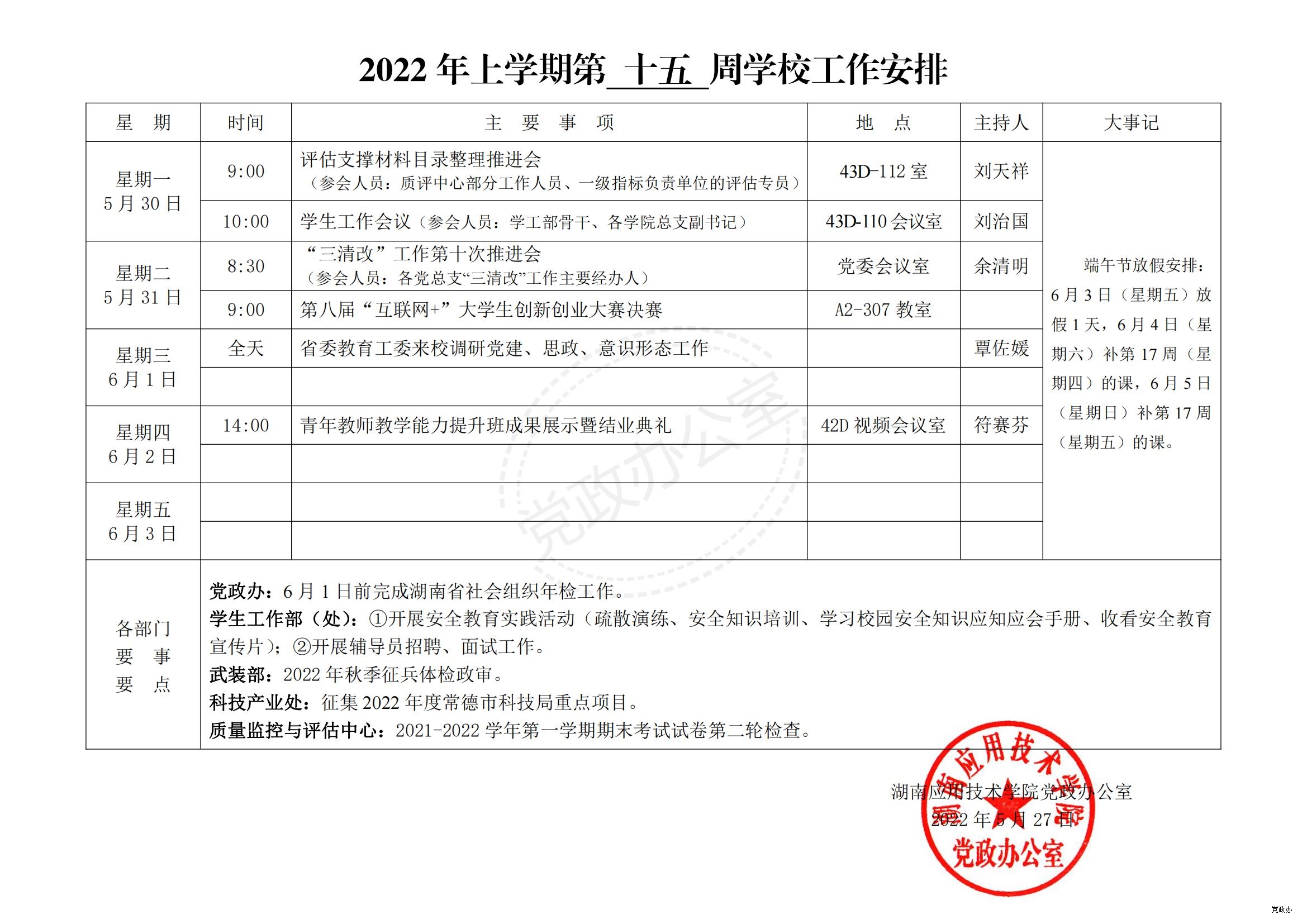 2022 年上学期第 十五 周学校工作安排