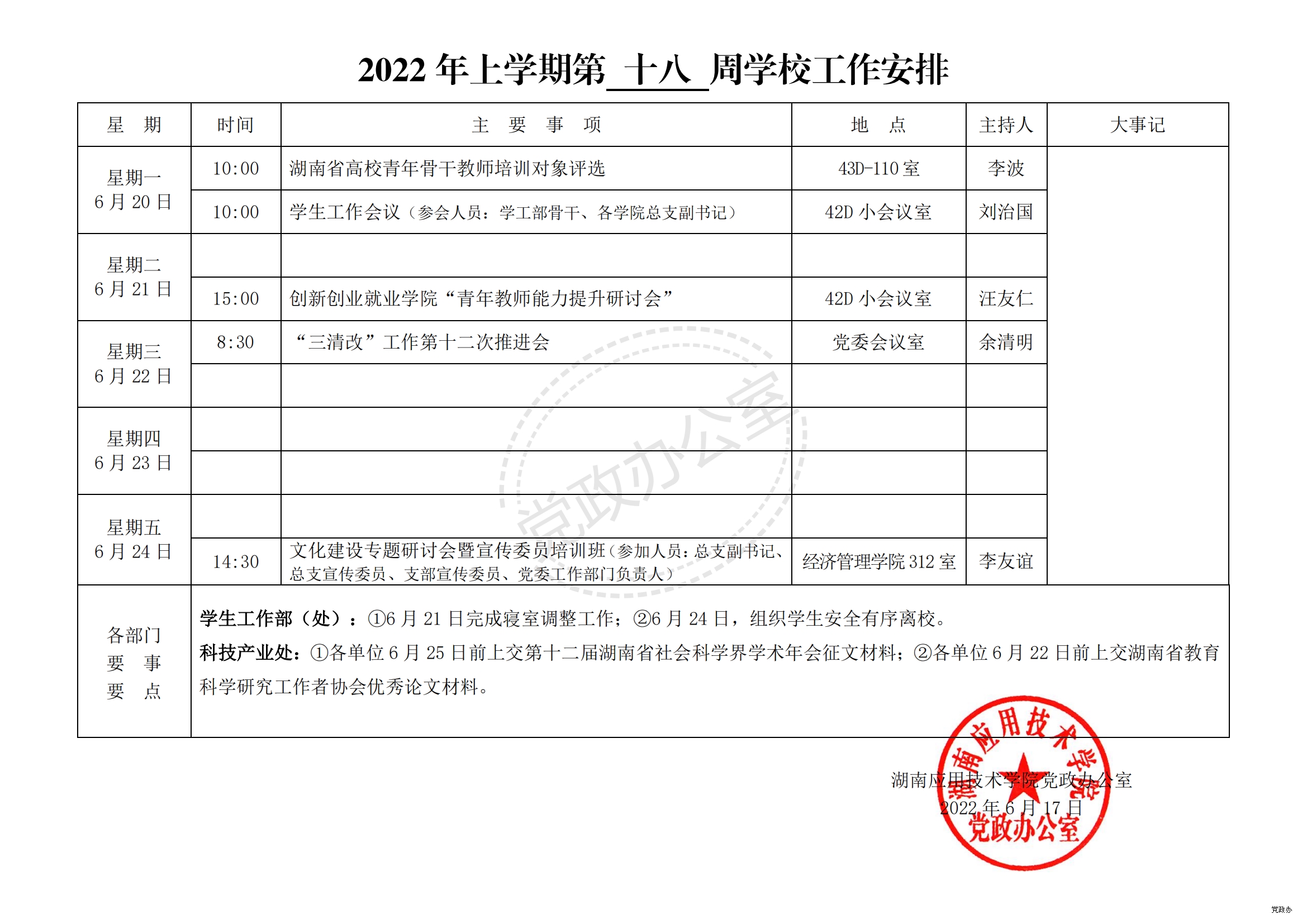 2022 年上学期第 十八 周学校工作安排