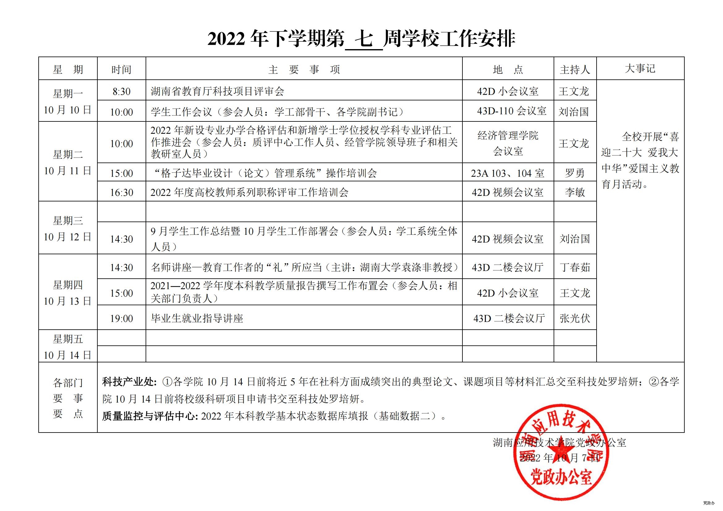 2022 年下学期第 七 周学校工作安排