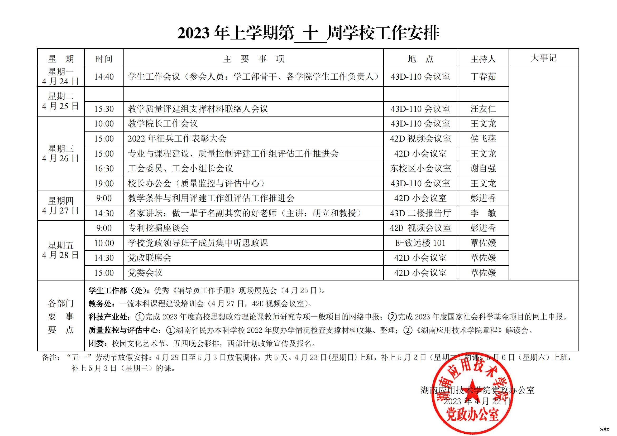 2023 年上学期第 十 周学校工作安排