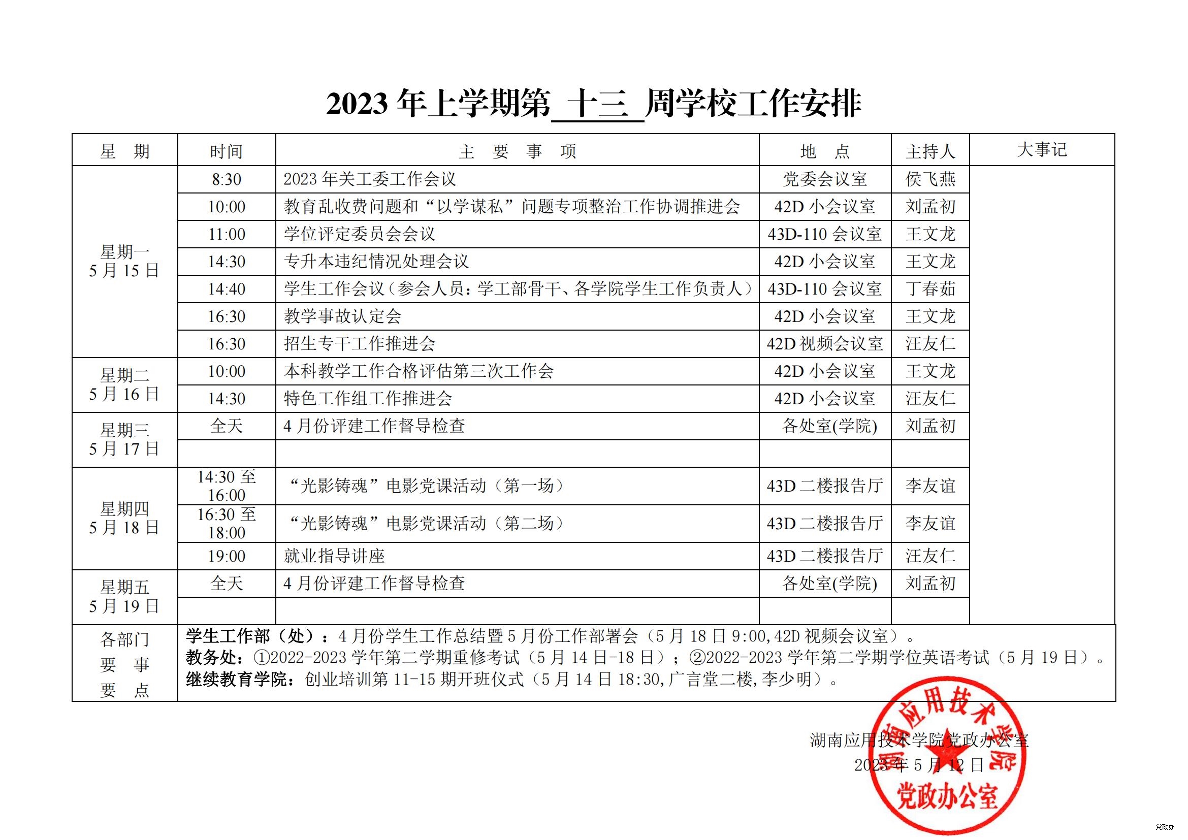 2023 年上学期第 十三 周学校工作安排