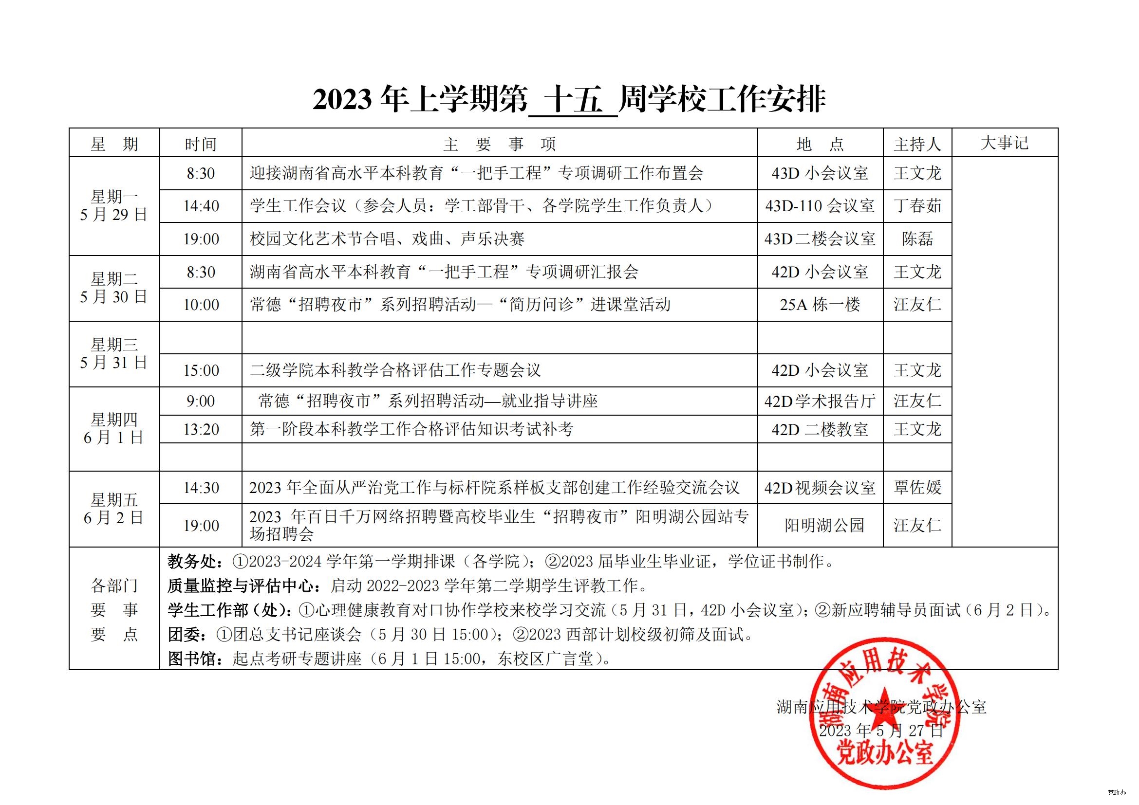 2023 年上学期第 十五 周学校工作安排
