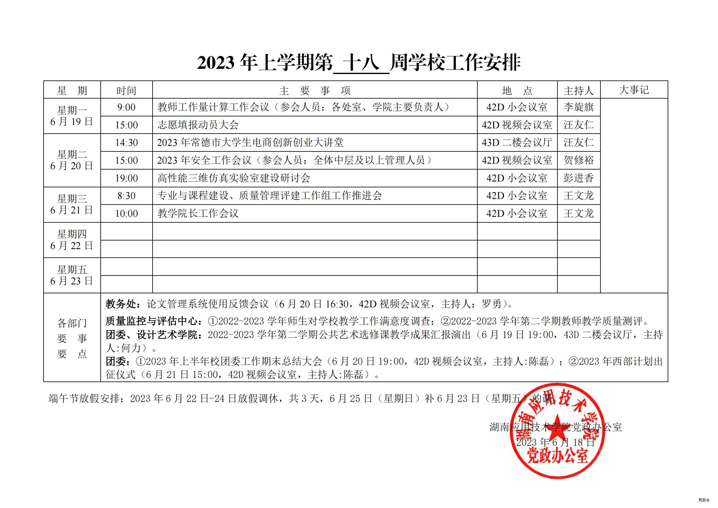 2023 年上学期第 十八 周学校工作安排