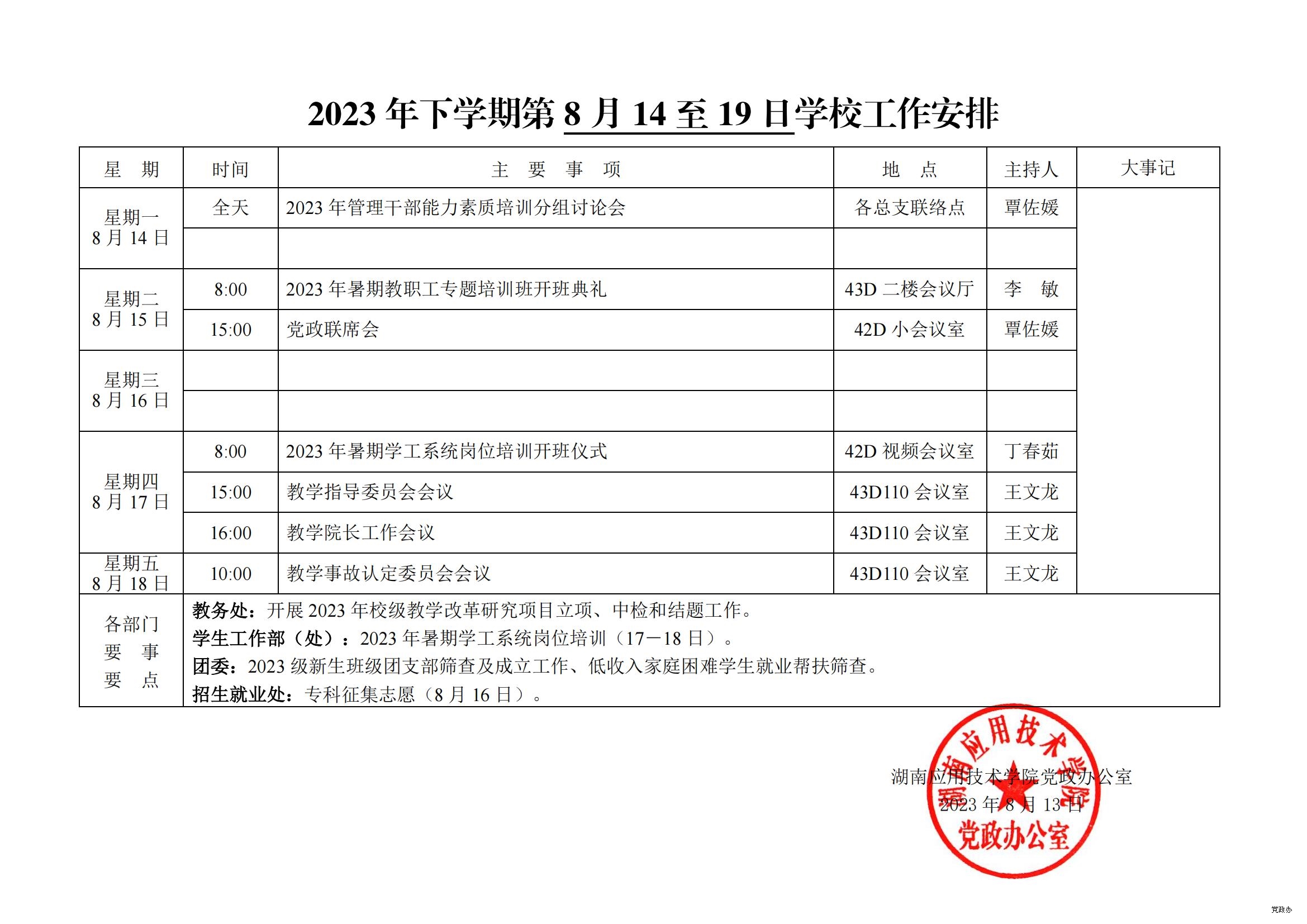 2023 年下学期 8月14至19日学校工作安排