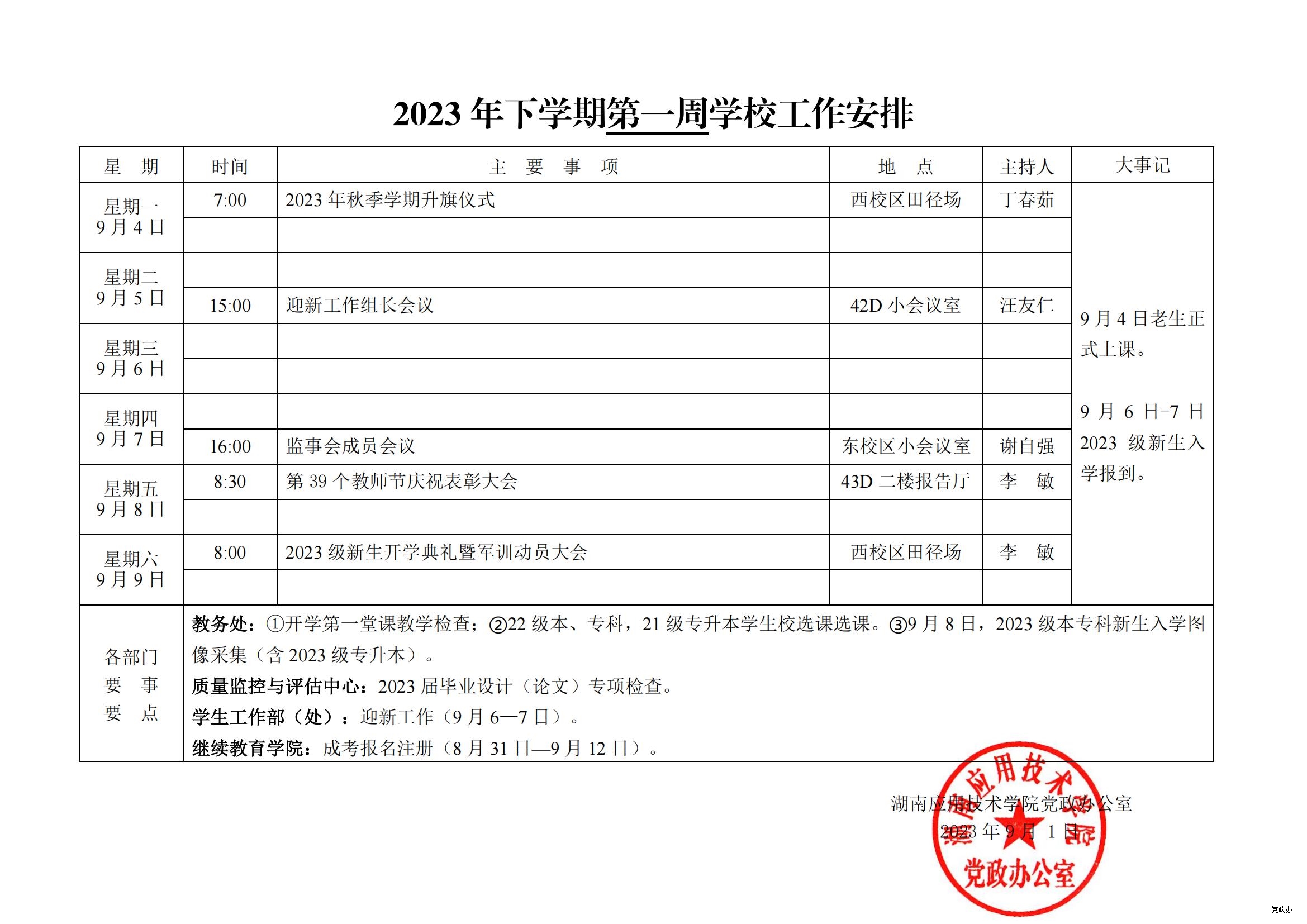 2023 年下学期第8月28至9月3日学校工作安排